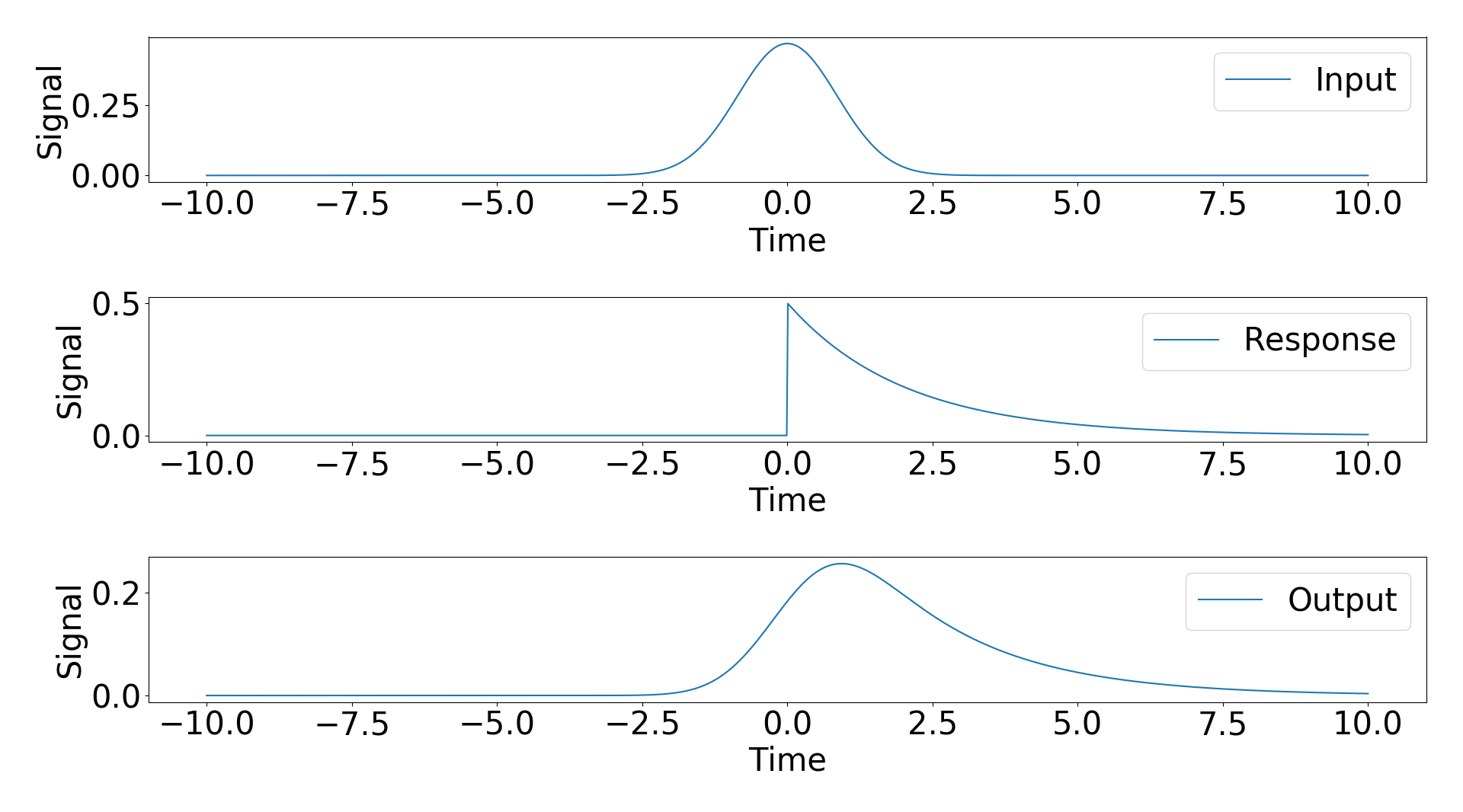 To try and answer this question I considered an example with an analytic result. My input signal is a Gaussian and my response function is a exponential decay with a step function. The analytic results of the convolution of these two signals is a modified Gaussian (https://en.wikipedia.org/wiki/Exponentially_modified_Gaussian_distribution).