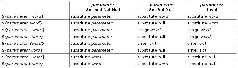 NOTE: This form also works, ${parameter-word}. If you’d like to see a full list of all forms of parameter expansion available within Bash then I highly suggest you take a look at this topic in the Bash Hacker’s wiki titled: “Parameter expansion“.