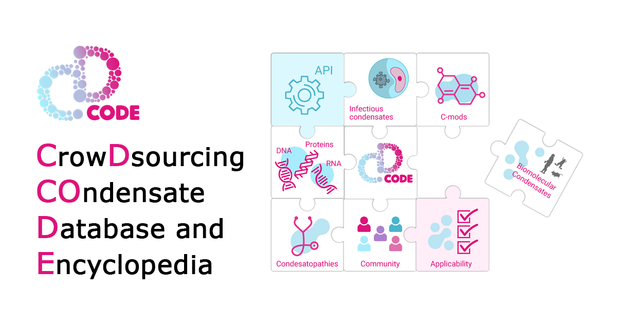 CD-CODE (CrowDsourcing COndensate Database and Encyclopedia) is a continuously updated versatile semi-manually curated crowdsourcing database of biomolecular condensates and their constituents (proteins and nucleic acids), including a repository of infectious condensates, condensate modulating drugs (c-mods) and condensate aberrations across diverse disease contexts (condensatopathies), as well as an encyclopedia for the scientific terms used to describe them.