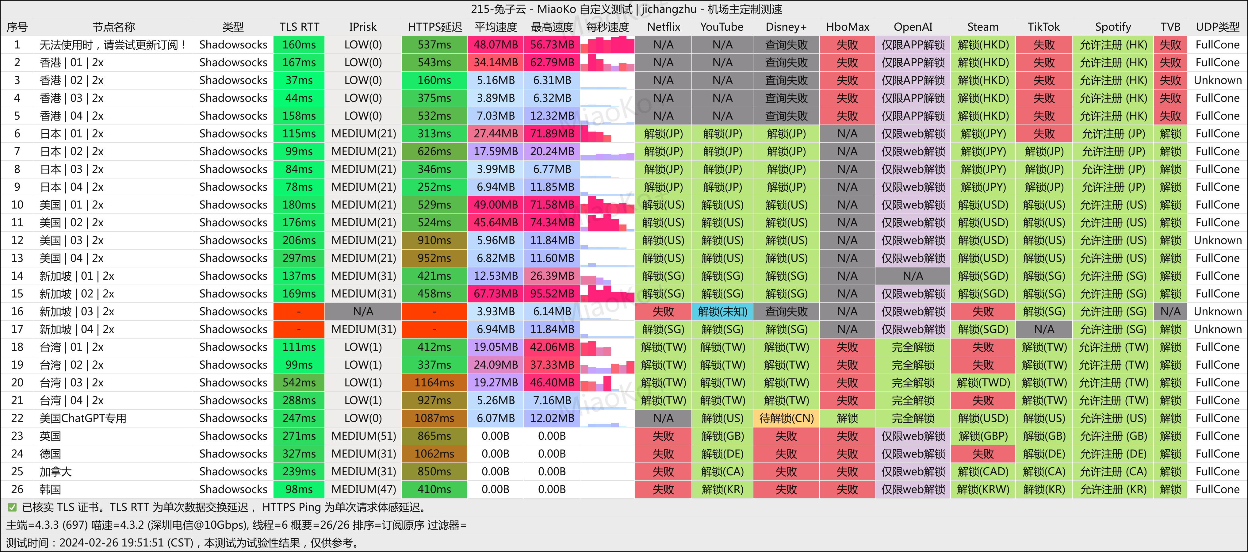 | 兔子云 | 正常 | 是 | 2022 | V2Ray | ChatGPT, Disney+, Netflix, TikTok | BGP, Clash, IEPL, IPLC, 不限设备数, 免费试用 | Android, iOS, macOS, Router, Windows | 支付宝 | 423 | https://c.clashnode.org/goto/rarbitscloud/ |