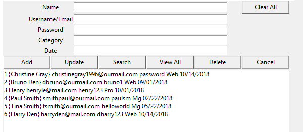 Account Management System project is written in Python. The project file contains a database file and python script (ledger.py). This is a simple GUI based project which is very easy to understand and use. Talking about the system, it contains all the required functions which include adding, viewing, deleting, updating and searching user account lists. While adding the account details of a person, he/she has to provide name, username/email, password, category, and date. The user can also update the account list if he/she wants to. For this, the user has to view all records, click on a record that he/she wishes to edit and press the update button. The system shows the account details in a list view. And also the user easily delete any account details.
