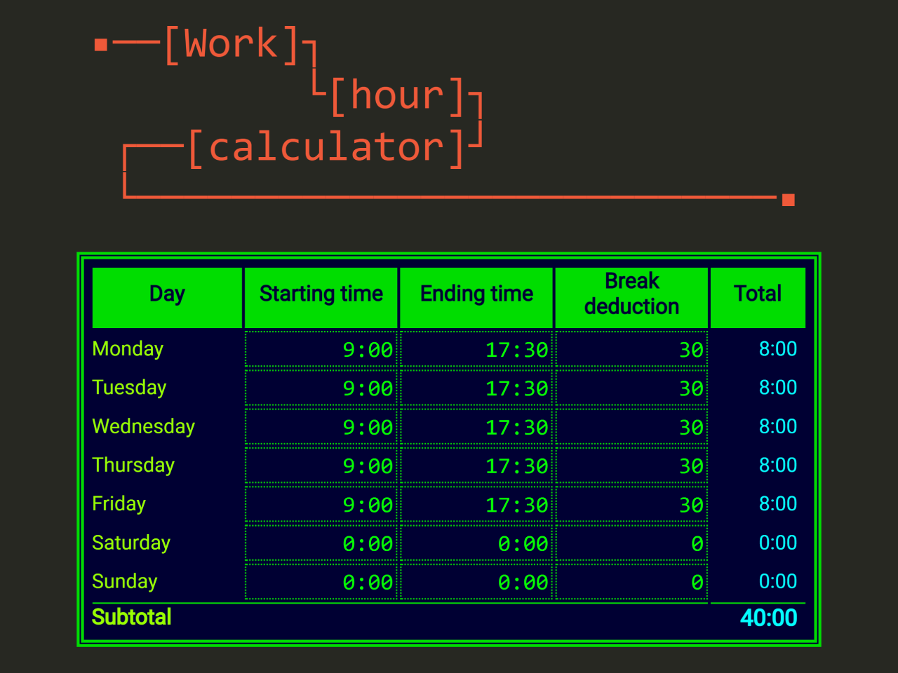 This JavaScript code enables you to easily calculate working hours across multiple days. It uses moment.js for time manipulation and jQuery for event handling. By inputting start and end times, along with break durations, it calculates the total hours worked each day and provides a subtotal for the entire week.