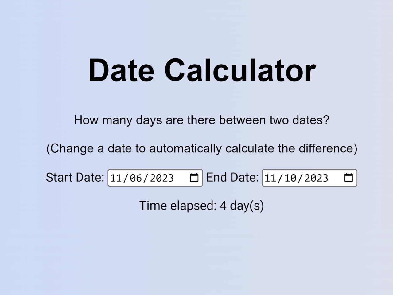 3. Finally, add the following JavaScript code to your website/app project. As users input or change dates, the JavaScript code dynamically computes and displays the elapsed time in days.