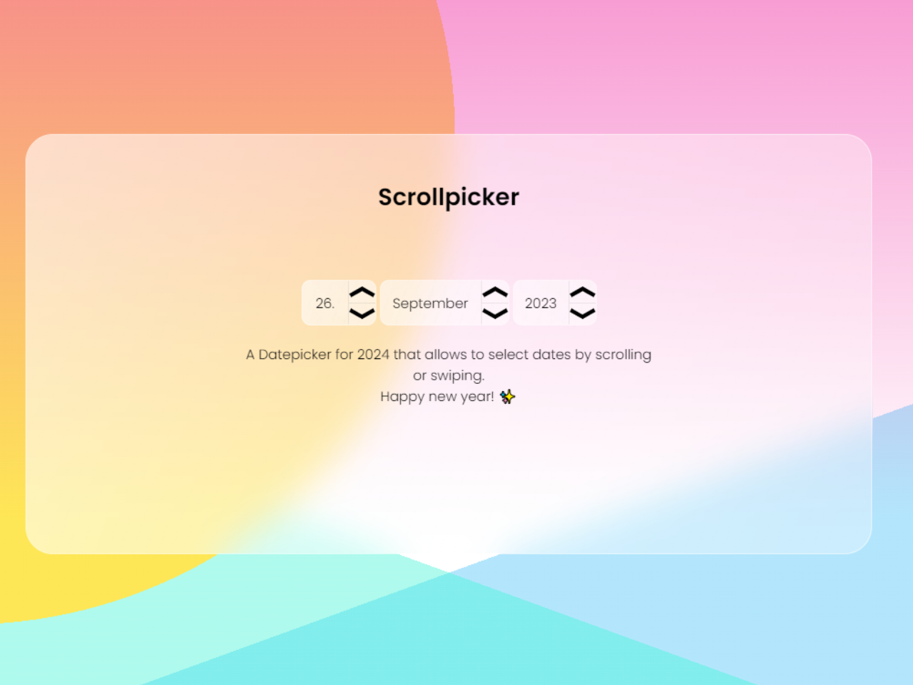 <div id="container"> <div class="glass"> <div class="picker"> <h1>Scrollpicker</h1> <div id="picker_container"> <div id="date_container"> <div id="datepicker"></div> <button class="buttone" id="dup" aria-label="date up"><svg width="100%" height="100%" viewBox="0 0 135 60" style="fill-rule:evenodd;clip-rule:evenodd;stroke-linecap:square;stroke-miterlimit:1.5;"> <path d="M15,44.133l52.067,-29.133l52.066,29.133" style="fill:none;stroke:#000;stroke-width:20px;" /> </svg></button> <button class="buttone bdown" id="ddown" aria-label="date down"><svg width="100%" height="100%" viewBox="0 0 135 60" style="fill-rule:evenodd;clip-rule:evenodd;stroke-linecap:square;stroke-miterlimit:1.5;"> <path d="M15,15l52.067,29.133l52.066,-29.133" style="fill:none;stroke:#000;stroke-width:20px;" /> </svg></button> </div> <div id="month_container"> <div id="monthpicker"></div> <button class="buttone" id="mup" aria-label="month up"><svg width="100%" height="100%" viewBox="0 0 135 60" style="fill-rule:evenodd;clip-rule:evenodd;stroke-linecap:square;stroke-miterlimit:1.5;"> <path d="M15,44.133l52.067,-29.133l52.066,29.133" style="fill:none;stroke:#000;stroke-width:20px;" /> </svg></button> <button class="buttone bdown" id="mdown" aria-label="month down"><svg width="100%" height="100%" viewBox="0 0 135 60" style="fill-rule:evenodd;clip-rule:evenodd;stroke-linecap:square;stroke-miterlimit:1.5;"> <path d="M15,15l52.067,29.133l52.066,-29.133" style="fill:none;stroke:#000;stroke-width:20px;" /> </svg></button> </div> <div id="year_container"> <div id="yearpicker"></div> <button class="buttone" id="yup" aria-label="year up"><svg width="100%" height="100%" viewBox="0 0 135 60" style="fill-rule:evenodd;clip-rule:evenodd;stroke-linecap:square;stroke-miterlimit:1.5;"> <path d="M15,44.133l52.067,-29.133l52.066,29.133" style="fill:none;stroke:#000;stroke-width:20px;" /> </svg></button> <button class="buttone bdown" id="ydown" aria-label="year down"><svg width="100%" height="100%" viewBox="0 0 135 60" style="fill-rule:evenodd;clip-rule:evenodd;stroke-linecap:square;stroke-miterlimit:1.5;"> <path d="M15,15l52.067,29.133l52.066,-29.133" style="fill:none;stroke:#000;stroke-width:20px;" /> </svg></button> </div> </div> </div> </div> </div>