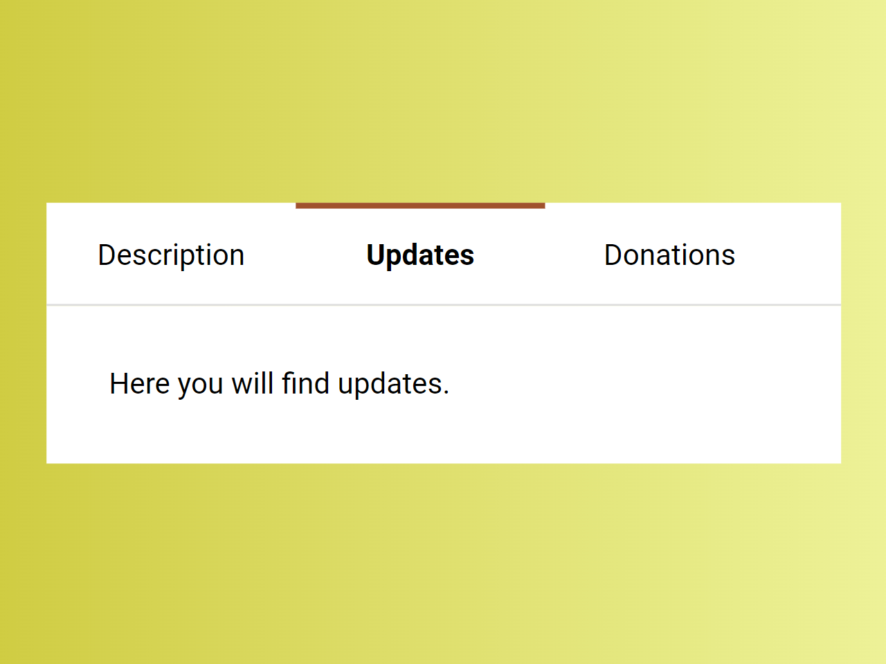 <div class="tabs"> <nav class="tabs-nav"> <ol class="nav-list"> <li class="nav-item"> <a href="#description" class="nav-link">Description</a> </li> <li class="nav-item"> <a href="#updates" class="nav-link">Updates</a> </li> <li class="nav-item"> <a href="#donations" class="nav-link">Donations</a> </li> </ol> </nav> <div class="tabs-panels"> <div class="tabs-panel" id="description" style="">Here you will find the description.</div> <div class="tabs-panel" id="updates" style="display: none;">Here you will find updates.</div> <div class="tabs-panel" id="donations" style="display: none;">Here you will find <a href="">donations</a>.</div> </div> </div>