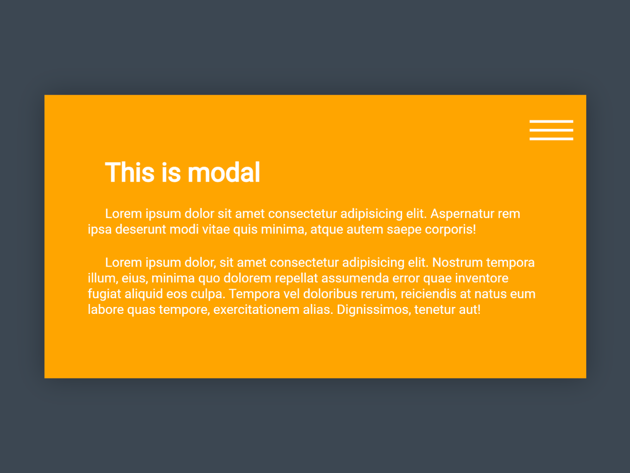 <div class="overlay"> </div> <div class="modal"> <h1>This is modal</h1> <p>Lorem ipsum dolor sit amet consectetur adipisicing elit. Aspernatur rem ipsa deserunt modi vitae quis minima, atque autem saepe corporis!</p> <p>Lorem ipsum dolor, sit amet consectetur adipisicing elit. Nostrum tempora illum, eius, minima quo dolorem repellat assumenda error quae inventore fugiat aliquid eos culpa. Tempora vel doloribus rerum, reiciendis at natus eum labore quas tempore, exercitationem alias. Dignissimos, tenetur aut!</p> <button class="modal__button-close"> </button> </div> <button type="button" class="modal__button-open">Open Modal</button>