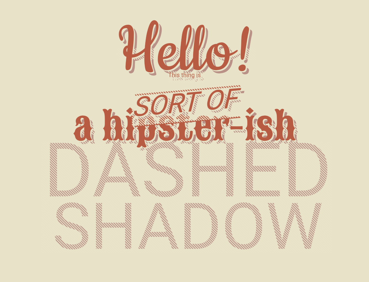<span data-text="Hello!" class="dashed-shadow hello">Hello!</span> <br /> <div data-text="This thing is" class="dashed-shadow">This thing is</div> <br /> <div class="sorta-block"> <div data-text="sort of"class="dashed-shadow sorta">sort of</div> </div> <div data-text="a hipster-ish" class="dashed-shadow hipsterish">a hipster-ish</div> <br /> <div class="dashed-shadow dashed-shadow-text">DASHED<br /><span class="shadow">SHADOW</span></div> <br />