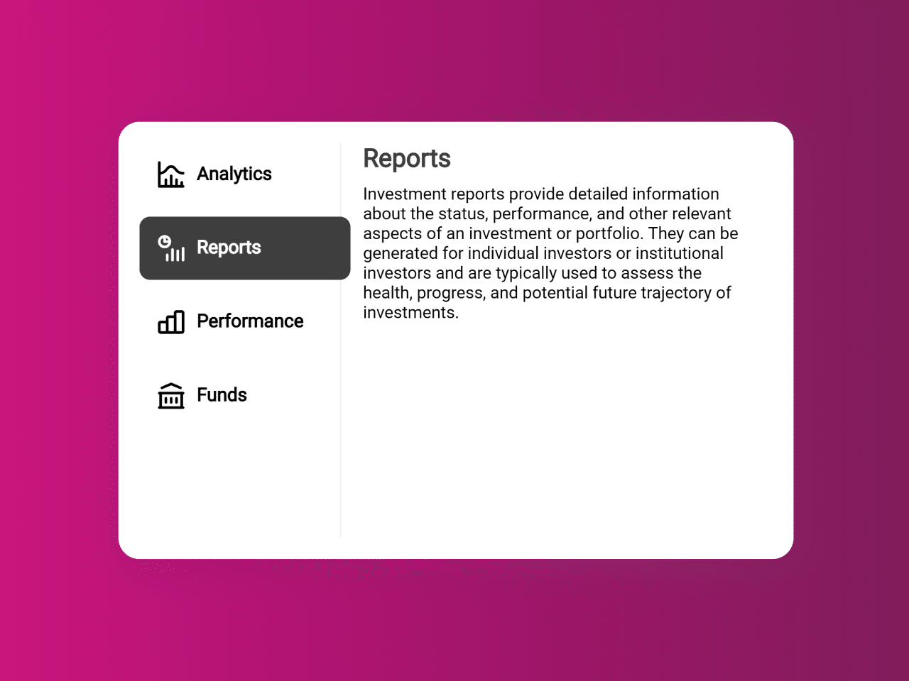 Investment reports provide detailed information about the status, performance, and other relevant aspects of an investment or portfolio. They can be generated for individual investors or institutional investors and are typically used to assess the health, progress, and potential future trajectory of investments.