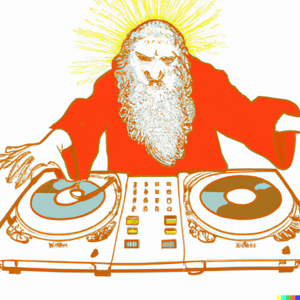 “Photorealistic image of God mixing tracks as a DJ - they’re scratching a turntable right now”