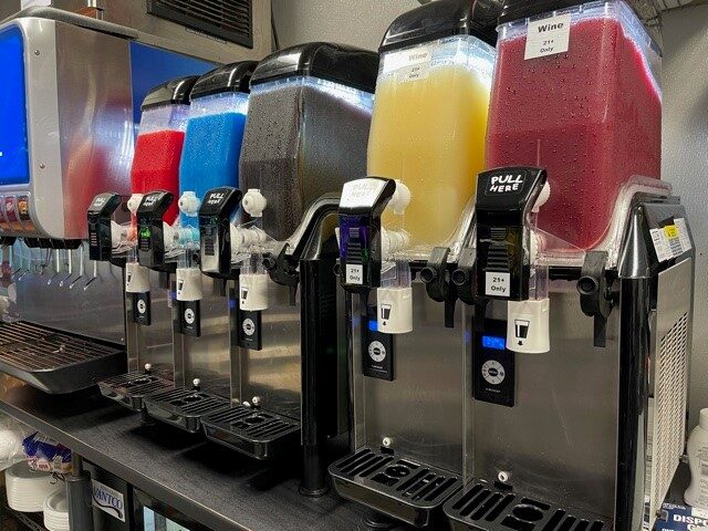 We have Pepsi products, slushies, Gatorade and energy drinks. 21 & older, bring your I.D., and choose from domestic, imported, and local craft beers including our very own IPA Combat Hops! We serve uber popular wine slushies too!