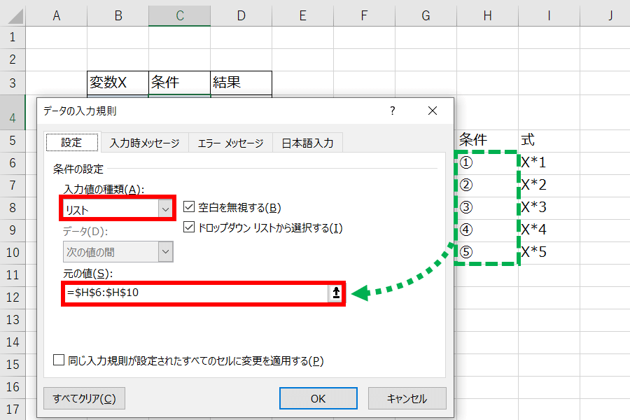 入力値の種類を「リスト」、元の値を「条件」のある範囲(サンプルではH6からH9)を指定します。