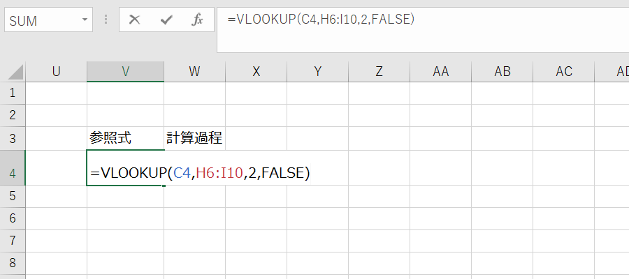 プルダウンで選択したものとリンクした式を出力するセルを指定します。サンプルでは「参照式」というセルを用意しました。ここにVLOOKUP関数を使って以下のように記述します。