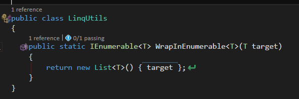 Here, I’ve laid a tiny seed for a Swiss Army Knife, “utils” class. Presumably, I will continue to dump any method I think might help me with Linq into this class. But for now, it contains only a single method to make things easy to understand. (As an aside, I discourage “utils” classes as a practice. I’m using this example because everyone reading has most assuredly seen one of these things at some point.)