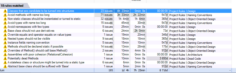 Out of the box, it calls out the issues detected in the codebase and it sorts them by quantity of tech debt. For example, I have many classes that could become structures and even more method names too long. (The latter because I give unit tests very long names, and this analysis includes the test projects). But the sort places classes to become structures first because NDepend (understandably) computes that this will take longer to fix than shortening method names.