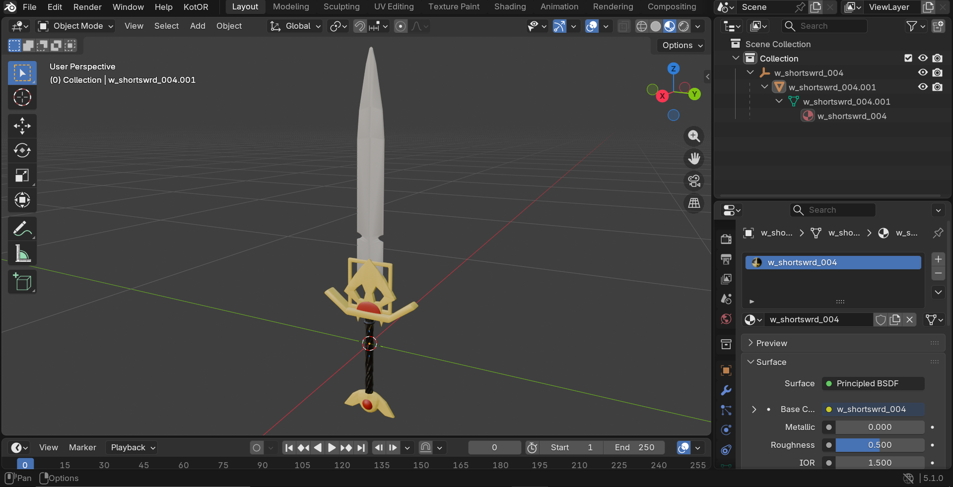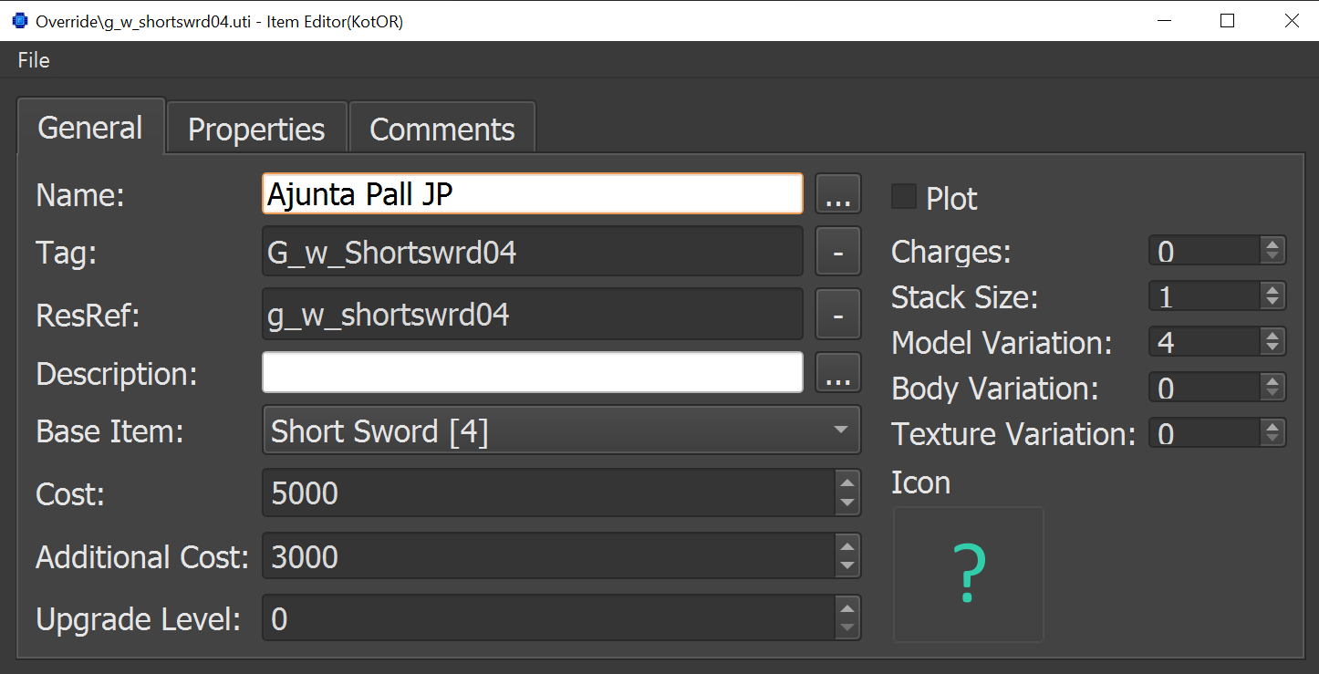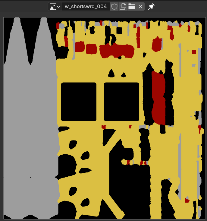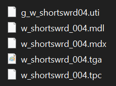 Hey there, I've finally had had the time to start making the mod, and I would like to know if someone could give some help. With Blender and KotorBlender I could import the .glb model, used an .mdl short-sword file extracted with HolocronTool to match the correct size and position of this new sword model, and changed the texture/color of every single component with some simple colors instead, and I obtain something like this: Then I create the "square" .tga for the texture (both raw .tga and normal .tga) on 1024x1024, and with tga2tpc transform it to .tpc. The final texture looks like this: And like this without those lines (I know it doesn't look really good, but it works) Then I created an .uti file with with HolocronTool that looks like this: So I have all of this files on the Overide folder (hadn't done the little icon, nor establish the "power"/"stats" of the sword/items, cause don't know how to do it yet) And with Kotor Save Editor I add this sword to an saved game, although while doing it, seems there's a problem with the textures (.tpc), as you can see here: But still I could add the sword item on save. Then played the game and used it on my character, it's the white square you can see over there with no name: And I can use it during gameplay with the short sword movements (I think), but for some reason it has no texture (which I think is related with the TPC warning I mentioned before). So I would like to know if someone could help me with this, to see were's the moment that the texture doesn't load or give me any advice of how to make this new item work on the game. If anyone could help me with this, I would be reallly grateful!2 points