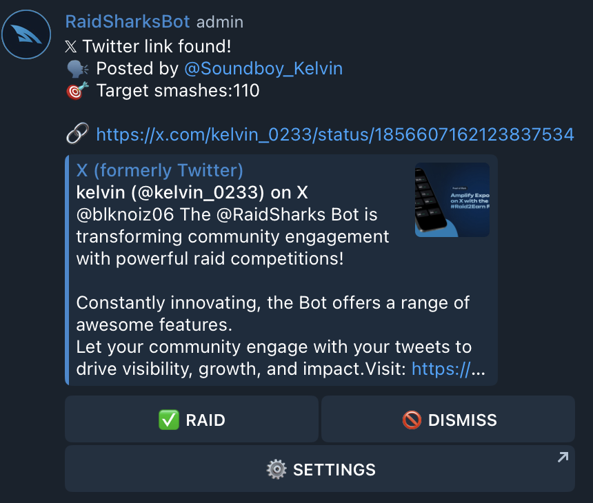 If admins decide to raid a provided tweet, RaidSharksBot will save this information to its internal database. \