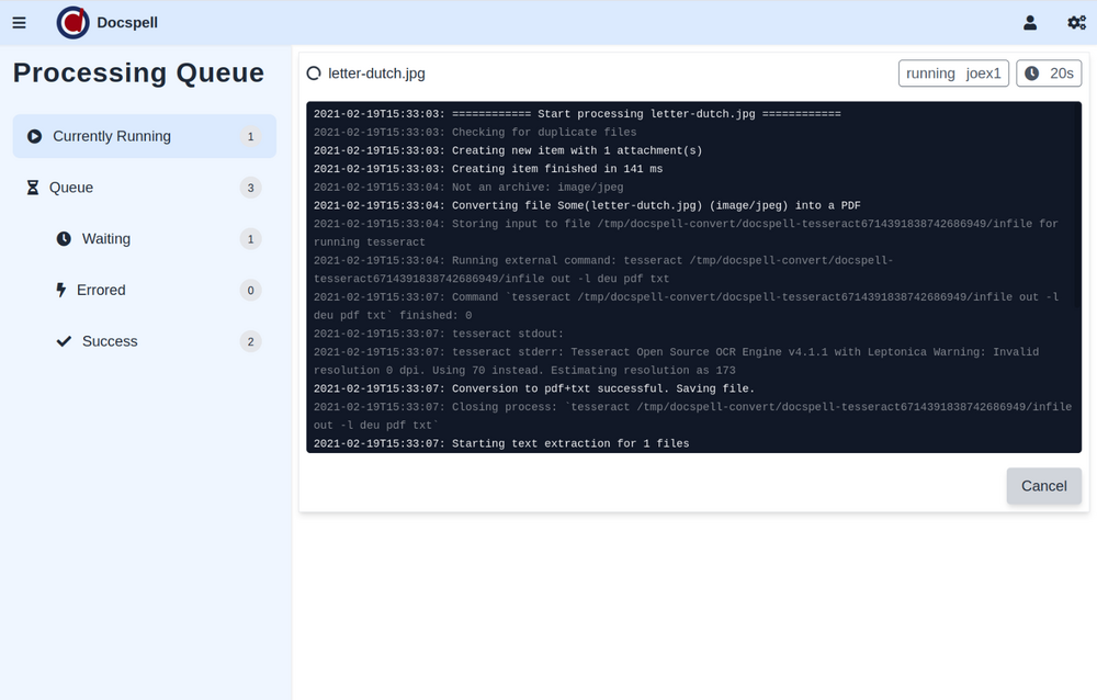 The page Processing Queue shows the current state of document processing for your uploads. The page currently only shows at most the 80 newest jobs. There is a maximum of 40 done jobs (successful, cancelled or failed) and 40 not done jobs.