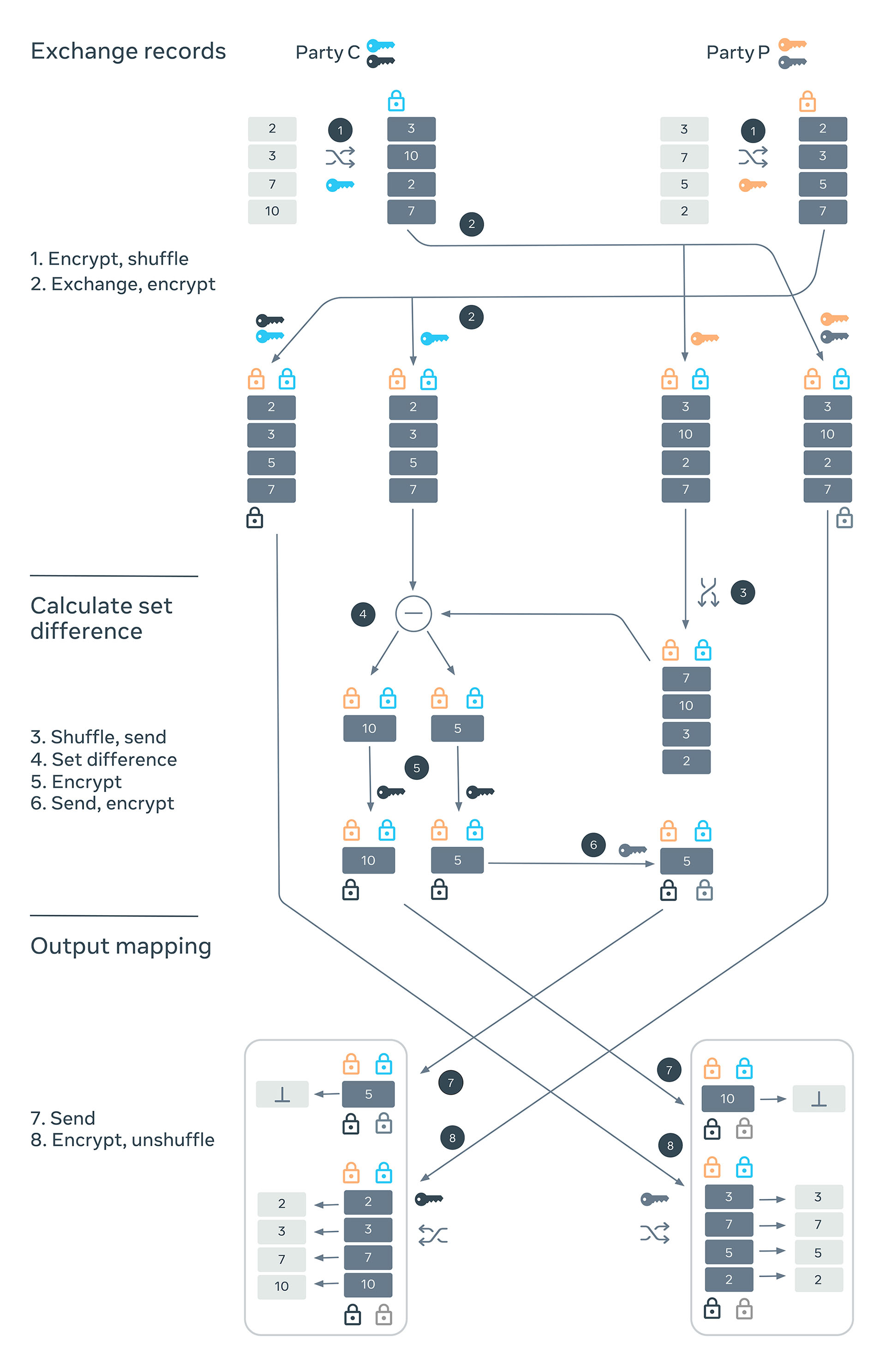 - Calculate set difference: The records that are encrypted with two keys can be used to calculate a symmetric set difference. Party P sends its doubly encrypted records to party C after shuffling. Party C calculates a symmetric set difference, which would allow each party to get identifiers for records that it doesn’t have.