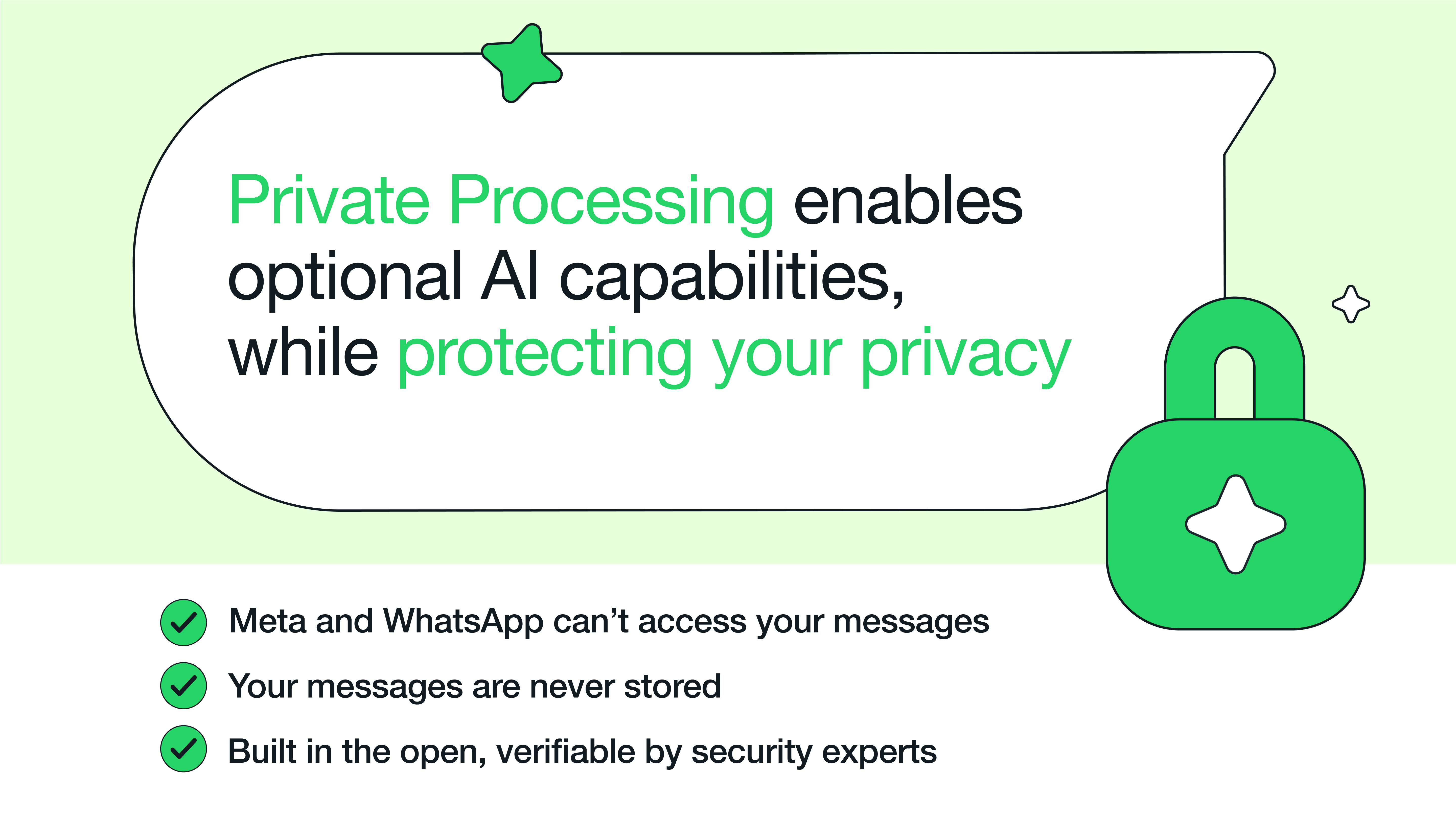 • We’re sharing an early look into Private Processing, an optional capability that enables users to initiate a request to a confidential and secure environment and use AI for processing messages where no one — including Meta and WhatsApp — can access them.