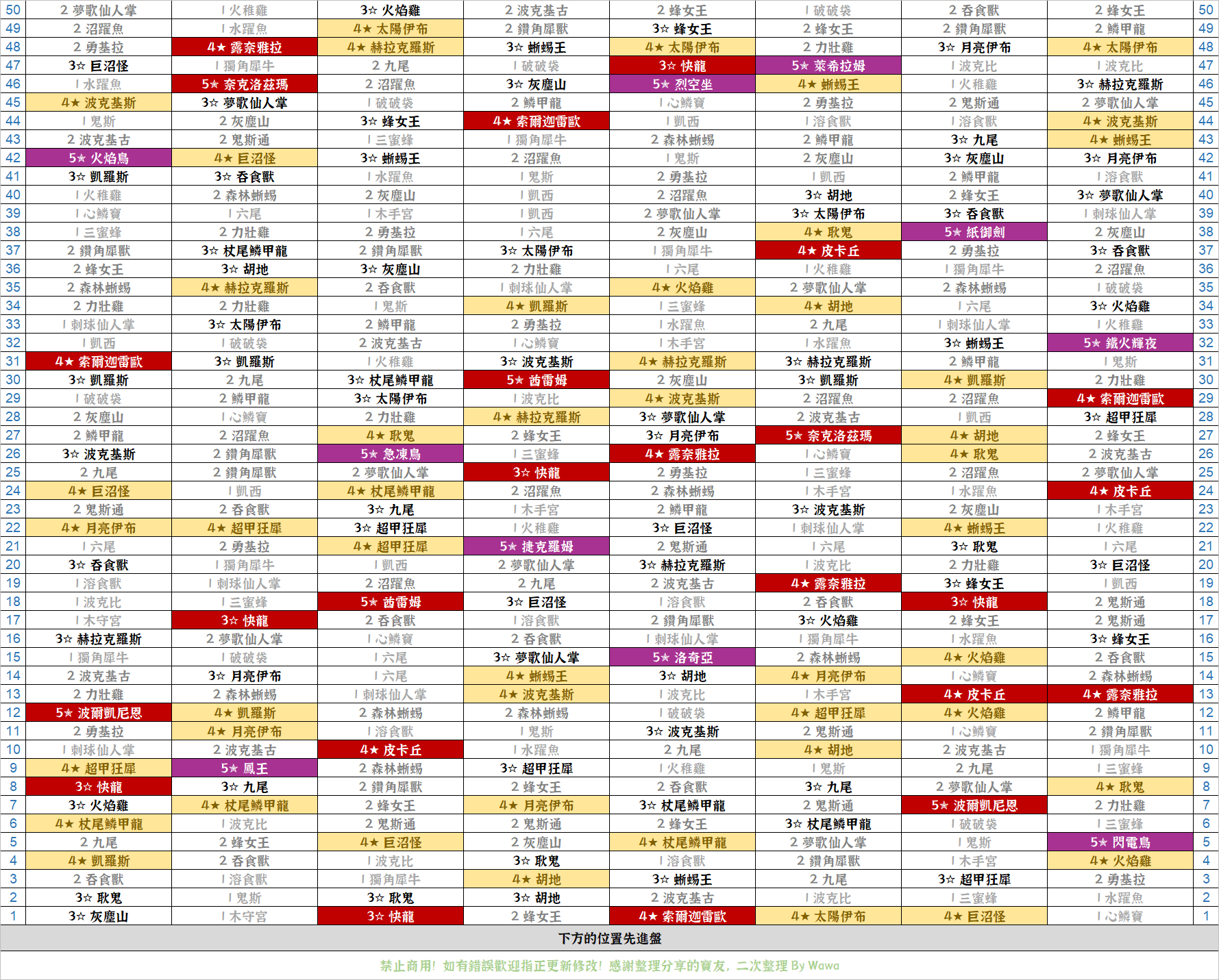 卡序版本很多,此整理版本五星紫卡就是紫色顯示,只要是 Lucky 卡就紅色顯示,有什麼好處呢?若有機會看到店家加入整條卡片,可以依照紫色與紅色的分配位置,大概就可以知道是哪條卡片,若是無法很順利地看到紫卡紅卡的分布,那麼也可以看最上面的一張卡片,也可以很快辨識出是哪一條唷!