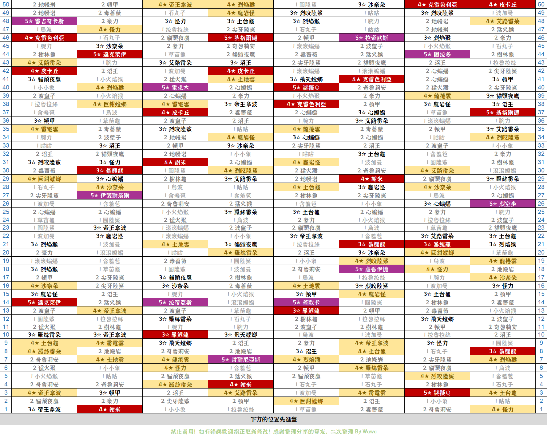 卡序版本很多,此整理版本五星紫卡就是紫色顯示,只要是 Lucky 卡就紅色顯示,有什麼好處呢?若有機會看到店家加入整條卡片,可以依照紫色與紅色的分配位置,大概就可以知道是哪條卡片,若是無法很順利地看到紫卡紅卡的分布,那麼也可以看最上面的一張卡片,也可以很快辨識出是哪一條唷!