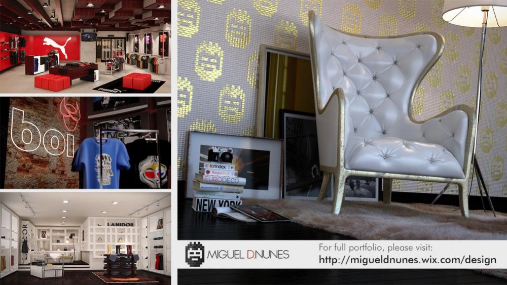 I have a five-year work experience in graphic and retail design and 3D visualisation/ animation (which include a good knowledge of video production, editing and post-production), and I have worked with brands like Puma, Rockport, Timex and Parfois, between others. For the last five years I have been working in the leading online shopping company in Lisbon from which the last two as a Design Manager of a mid-size team providing brand visual communication, interior retail designs and 3D visualisations/animations and videos focusing on customer experience and brand identity. Most of my work, as it was requested by the clients and can be seen on my portfolio, was mostly retail design and 3D visualisations with small animations of the store interiors, however, I feel comfortable with exteriors as well, and some animation. There was also a lot of graphic and web design work that had to be done (almost every graphic element in the 3D stores were my creation), like graphic communications of the brand stores, and every graphic element of the website.