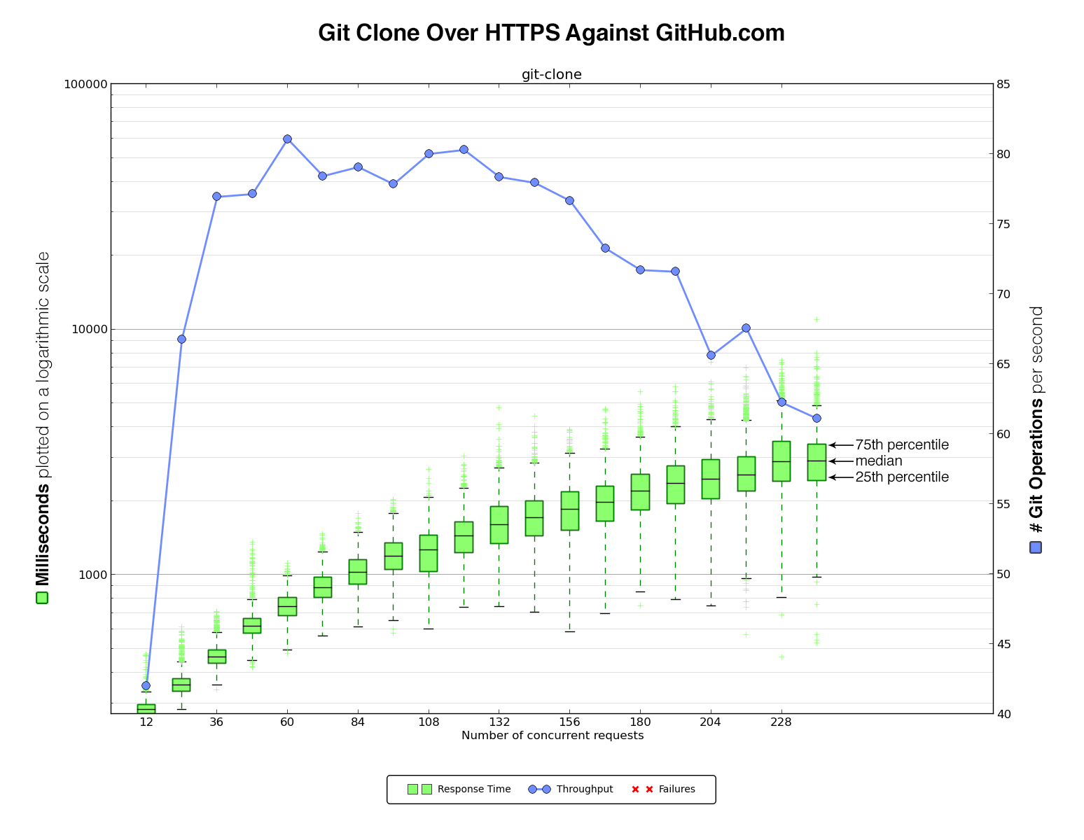We considered a few benchmarking solutions to test the performance of the all-important git clone operation. In the end, we opted for a simple yet effective solution: a script that could run a series of simultaneous git clone commands against an Enterprise server.