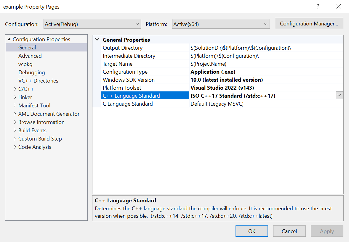 Use Vcpkg Manifestis turned on andC++ Language Standardis C++17.