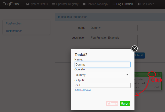 - Task: is used to define the fog function name and the processing logic (or operator). A task has input and output streams.