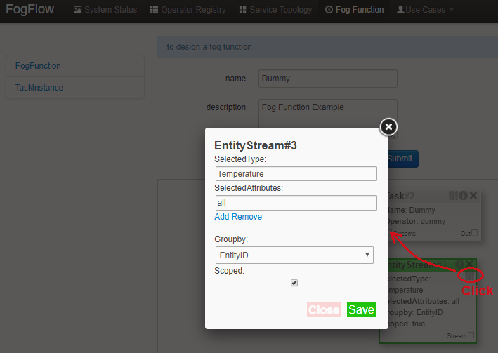 Configure the EntityStream by clicking on its configuration button as shown below. "Temperature" is shown as example here, as is the entity type of input data for the "dummy" fog function.