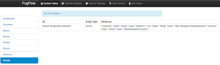 }'Outputs of the Service Topology will be published to the Broker, any application subscribing to the data will receive the notification. An actuator device can also receive these streams as inputs from the Broker. Resulting streams will also be visible in the Streams menu on FogFlow dashboard.