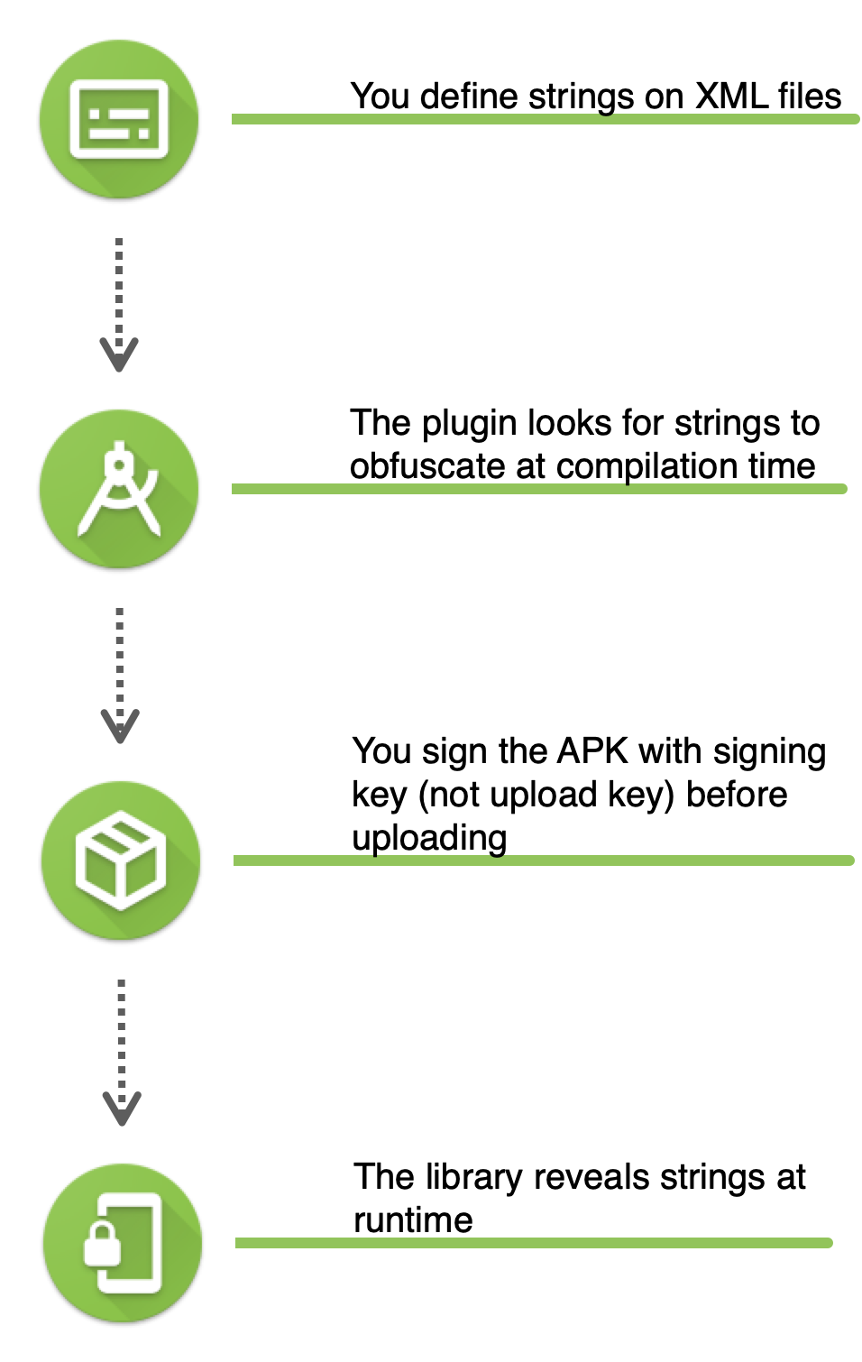 StringCare (SC) is a combination of tools (Android Studio Gradle plugin + Android library) that manage strings and assets files in your Android application. Developers set easily on XML files what strings and assets should be obfuscated before using them on the code.
