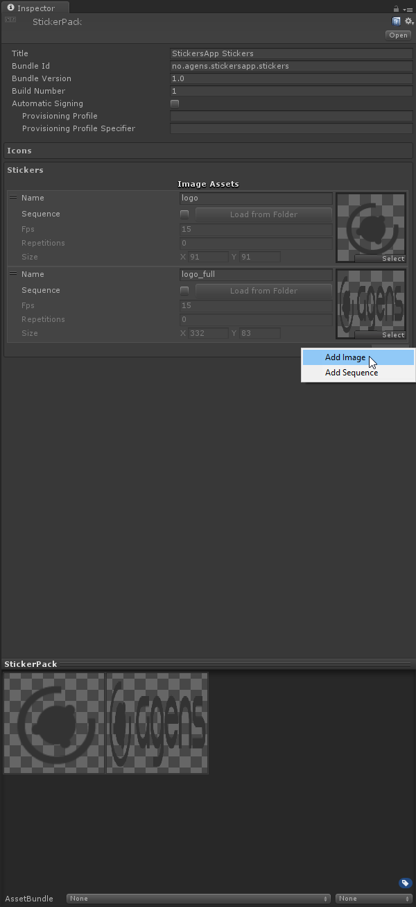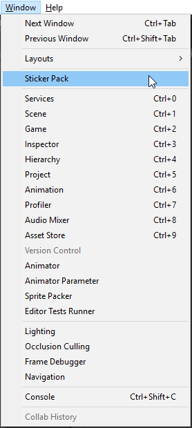 You do this by selecting the Sticker Pack menu item from within Unity. This will create the StickerPack asset for you if it is not set up yet and then select it.