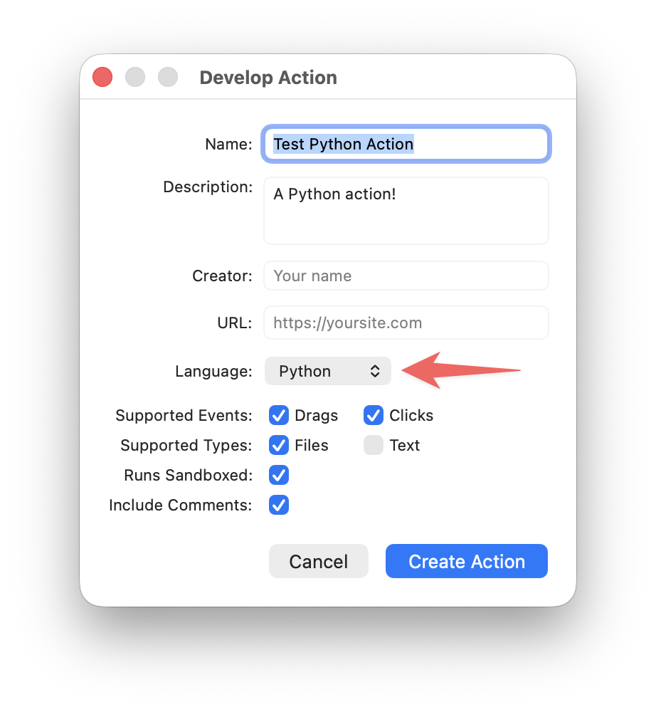 endThe easiest way to develop a new Python action is to click the white plus in the top left of the grid and choose the 'Develop Action...' item and then select 'Python' from the language drop down as shown below: