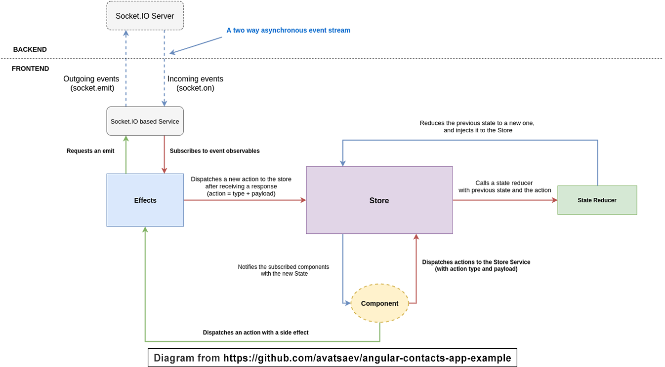 This application uses @ngrx/store to manage application state, and @ngrx/effects to manange side effects (http+sockets), It also uses NgRx fractal state management to leverage lazy loading of reducers and effects.