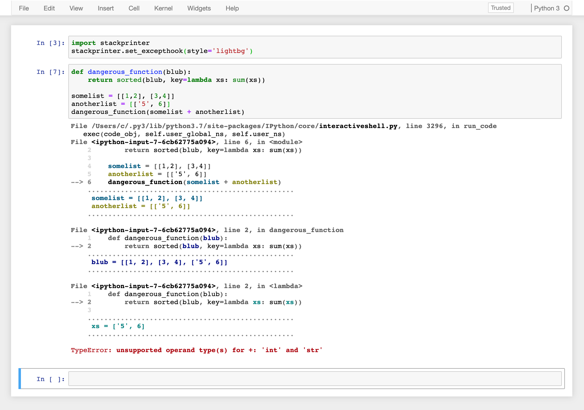 stackprinter.set_excepthook(style='darkbg2')  # for jupyter notebooks try style='lightbg'