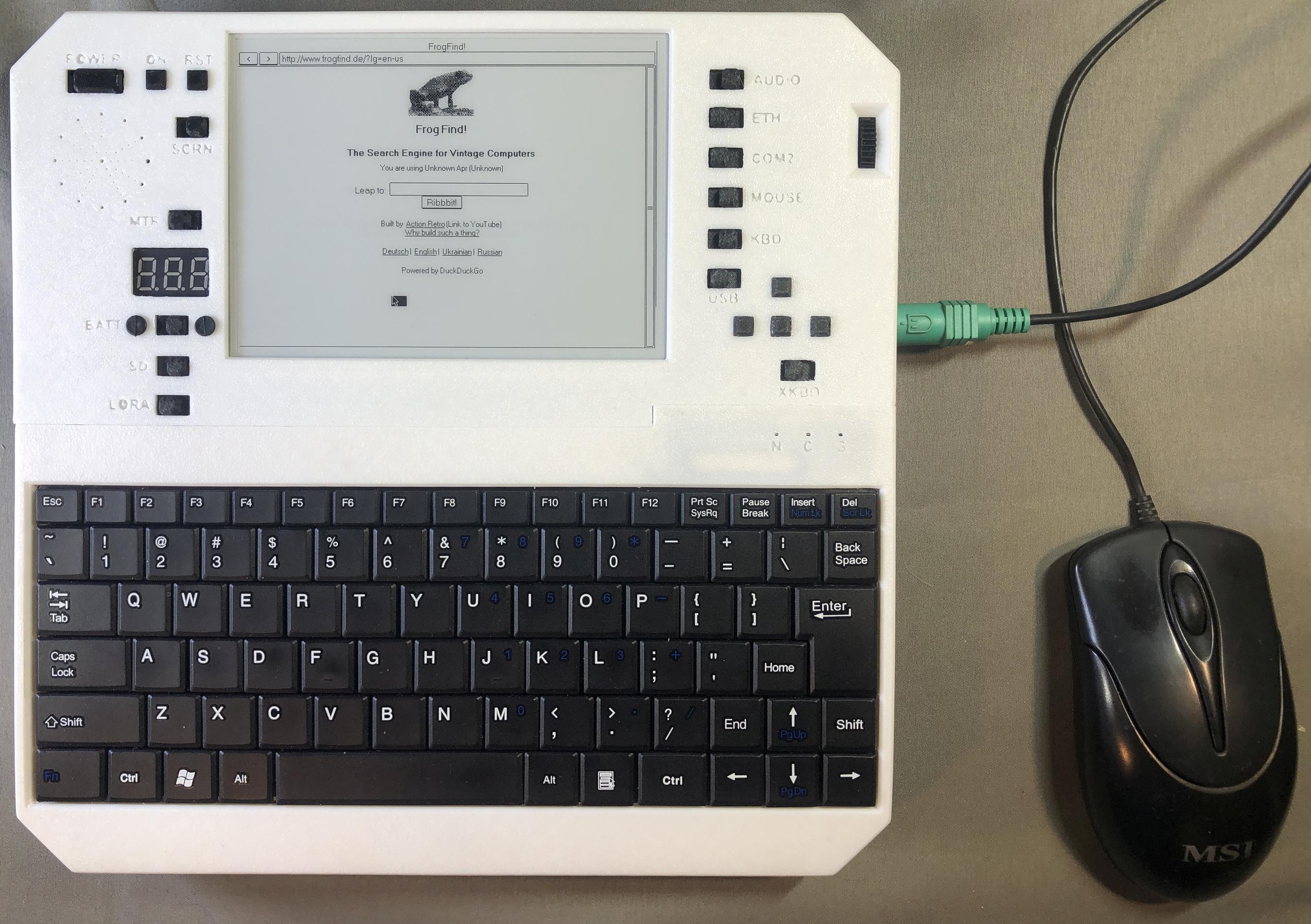 It features a built in keyboard, external PS/2 keyboard and mouse ports, full CGA, Hercules, and MCGA graphics support, partial EGA and VGA support, PC speaker, Adlib, Covox, and Disney Sound Source audio output, built in speaker and headphone jack with volume control wheel, one DB9 RS232 serial port, one TTL serial port, dual keyboard and mouse PS/2 ports, USB flash drive port for convenient file transfer, an RJ45 ethernet port, wifi, and LoRA radio (I wrote a LoRA realtime chat client in QBASIC in about 15 minutes). Bluetooth hardware is present but I have not yet implemented it in any features, though I plan to add support for BT keyboard and mouse, and maybe serial over BT, IP over BT, audio over BT, and BT file transfer. The keyboard can be easily detached on a short tether to make it convenient to prop up the device at an angle while placing the keyboard on a flat surface. Or you can just plug in your own to the PS/2 port, as sometimes it's nice to be able to use a full sized keyboard, though the one I built into this device is big enough for normal typing.