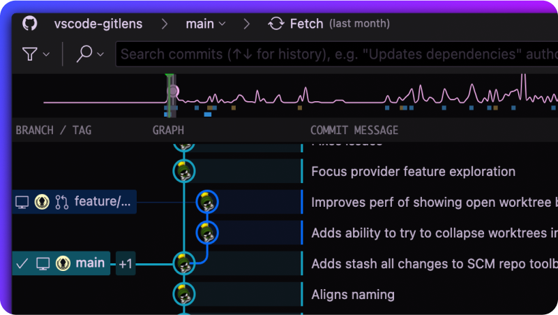 Understanding who made changes, when, and why can be challenging. GitLens simplifies this with tools like the Commit Graph, Inspect, Inline Blame, and Hovers, giving you clear context and insights. Quickly explore your repository's history with intuitive visuals and actionable tools.