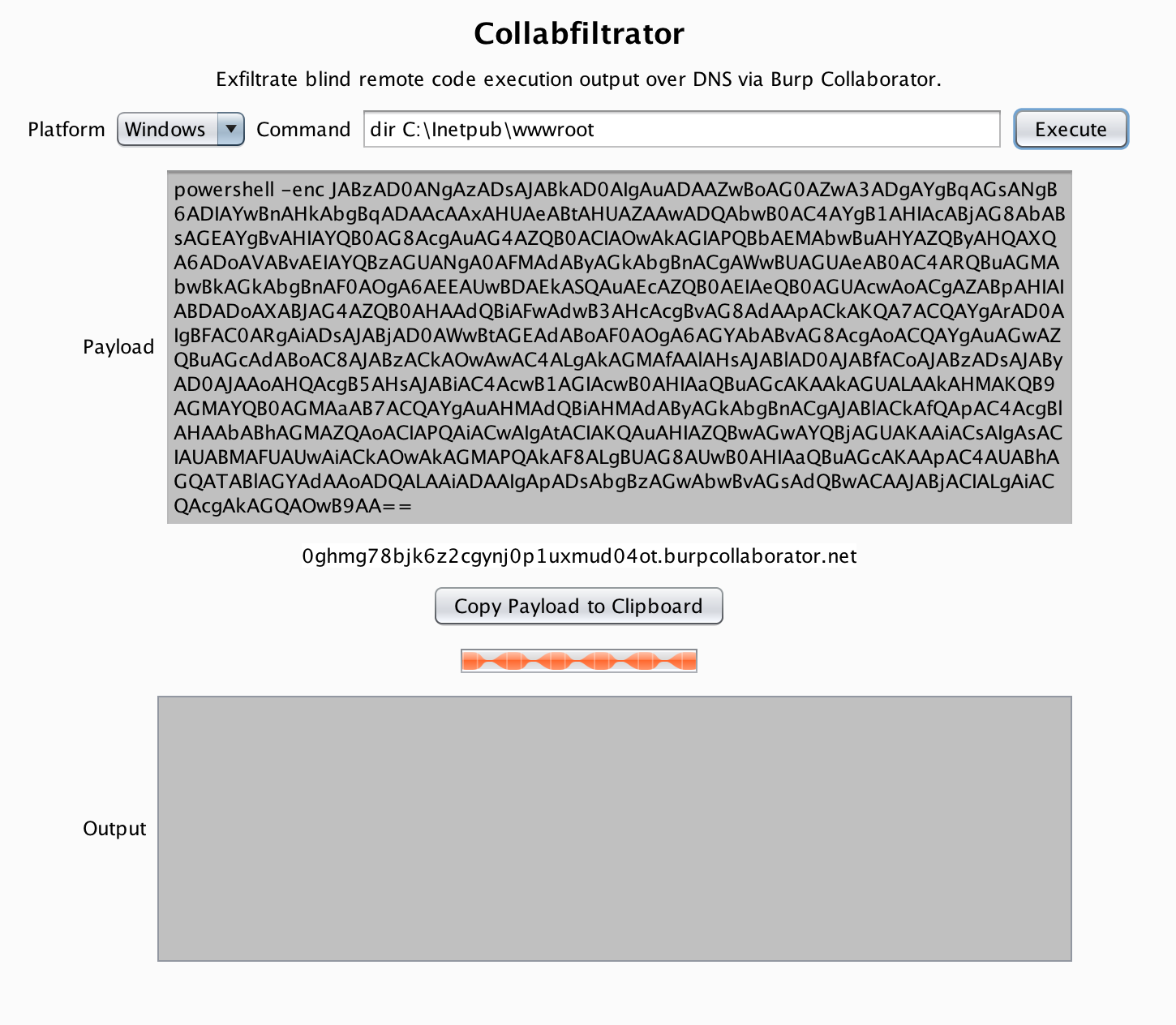 Select a platform from the dropdown menu, enter the desired command, and press Execute. A payload will be generated for the platform you choose. Select Copy Payload to Clipboard, run the generated payload on your target, and wait for results to appear in the output window.