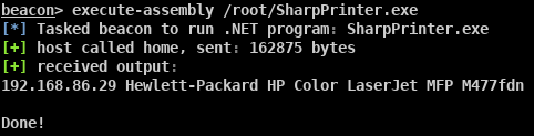 SharpPrinter Printer is a modified and console version of ListNetworks As an example, one could execute SharpPrinter.exe through Cobalt Strike's Beacon "execute-assembly" module. Example usage beacon>execute-assembly /root/SharpPrinter/SharpPrinter.exe