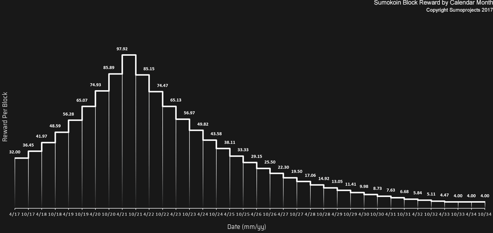 - Emission scheme: Sumokoin's block reward changes every 6-months as the following "Camel" distribution* (inspired by real-world mining production like of crude oil, coal etc. that is often slow at first, accelerated in the next few years before declined and depleted). However, the emission path of Sumokoin is generally not far apart from what of Bitcoin (view charts below).