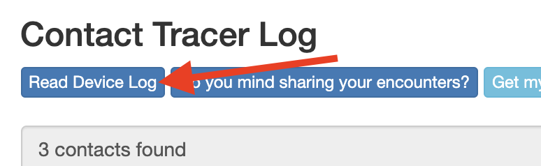 When you get home, check the for blue LED. It'll be on if any health-related contacts were logged. (The red LED is always on.) To read out your contact log, go back to the Chrome-App (config.html) to read any contact information that came in while you were out. Click on the blue "read device log" button: