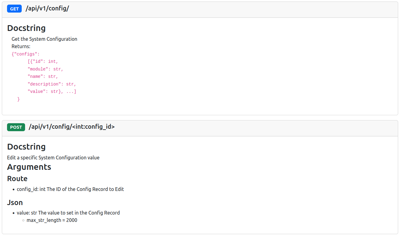 Using the data provided through parameters, docstrings, and Flask route registrations, Flask Parameter Validation can generate an API Documentation page. To make this easy to use, it comes with a blueprint and the configuration options below: