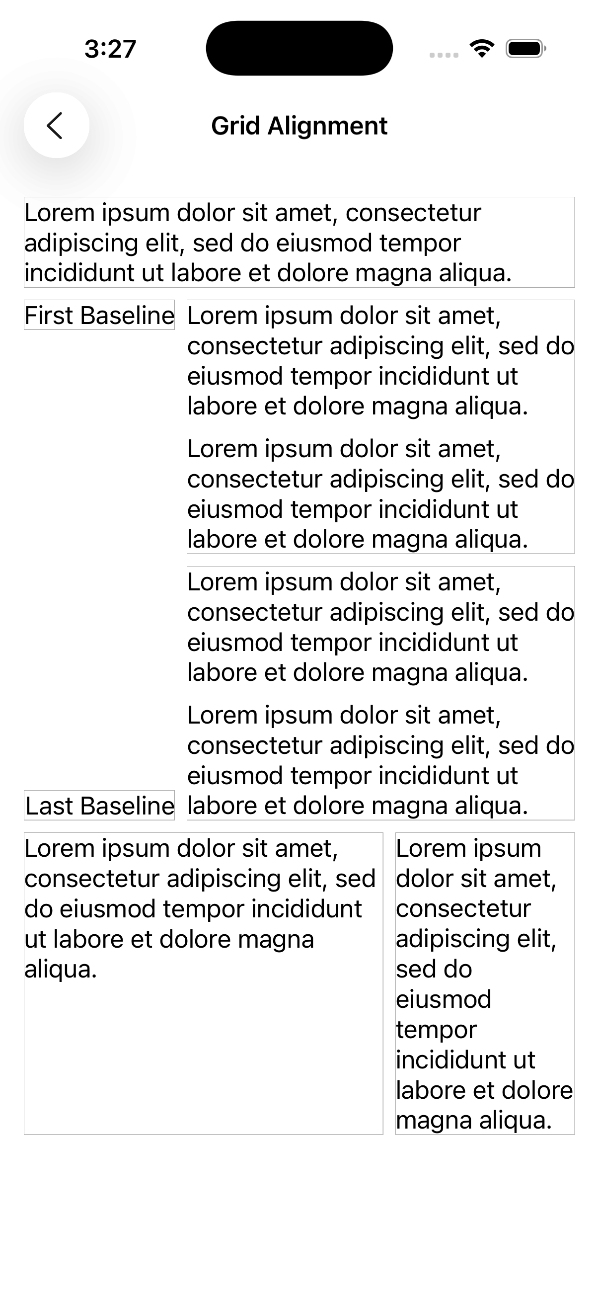 The isAlignToBaseline property is used to toggle baseline alignment in row and column views: