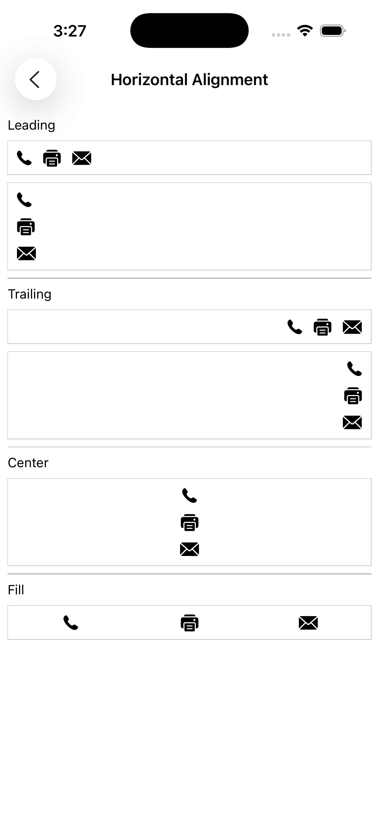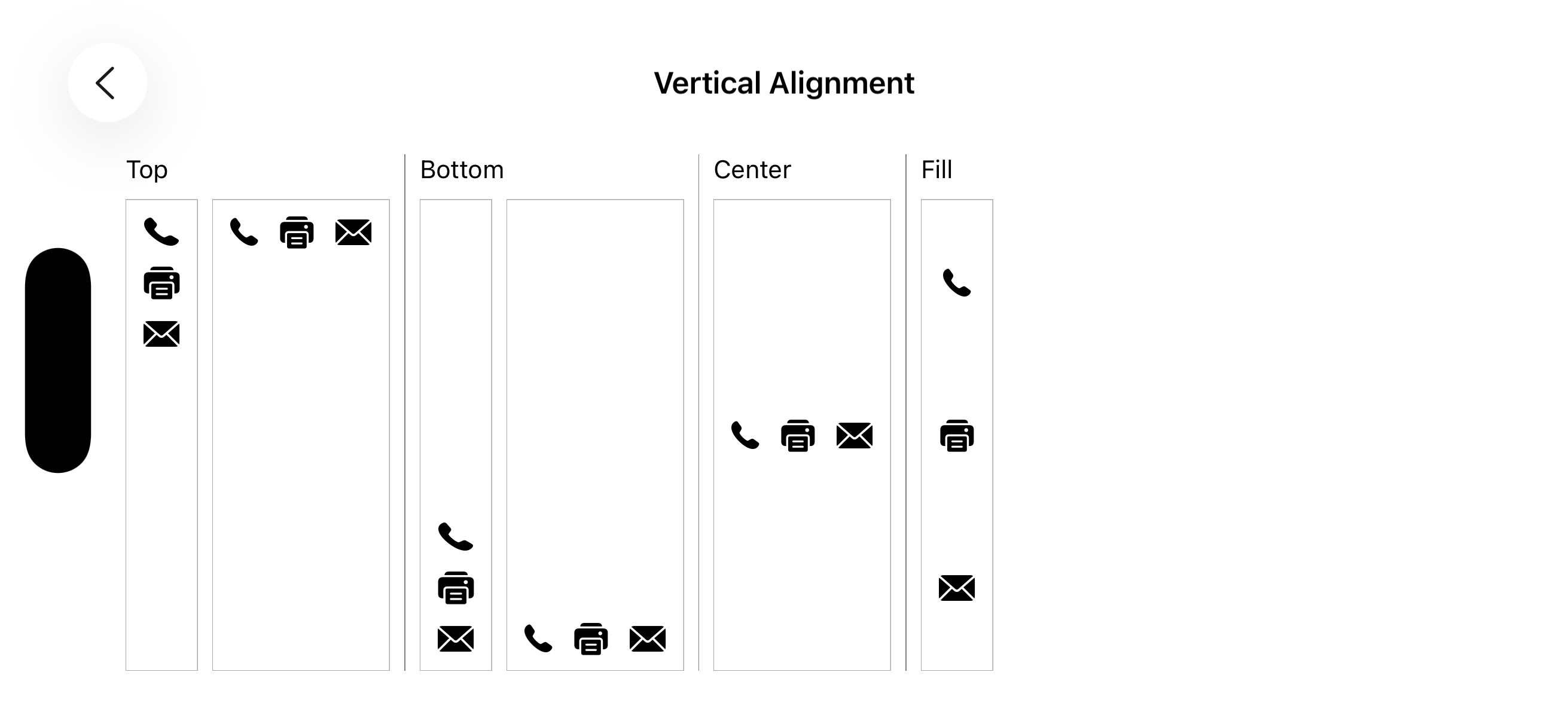 The first two properties specify the horizontal and vertical alignment, respectively, of the box view's subviews. Horizontal alignment options include fill, leading, trailing, and center. Vertical alignment options include fill, top, bottom, and center. Both values are set to fill by default, which pins subviews along both of the box view's axes. Other values pin subviews to a single edge or center them along a given axis: