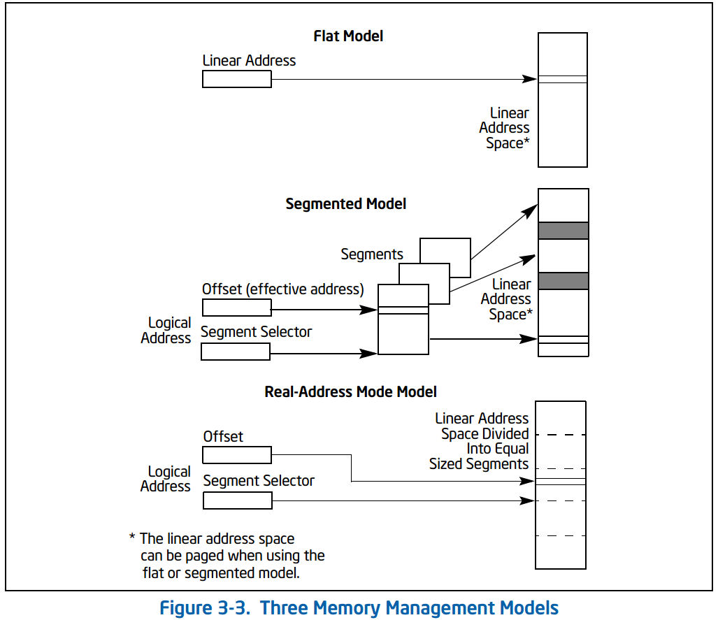 flat,segmented, orrealaddress mode. - Flat memory model: