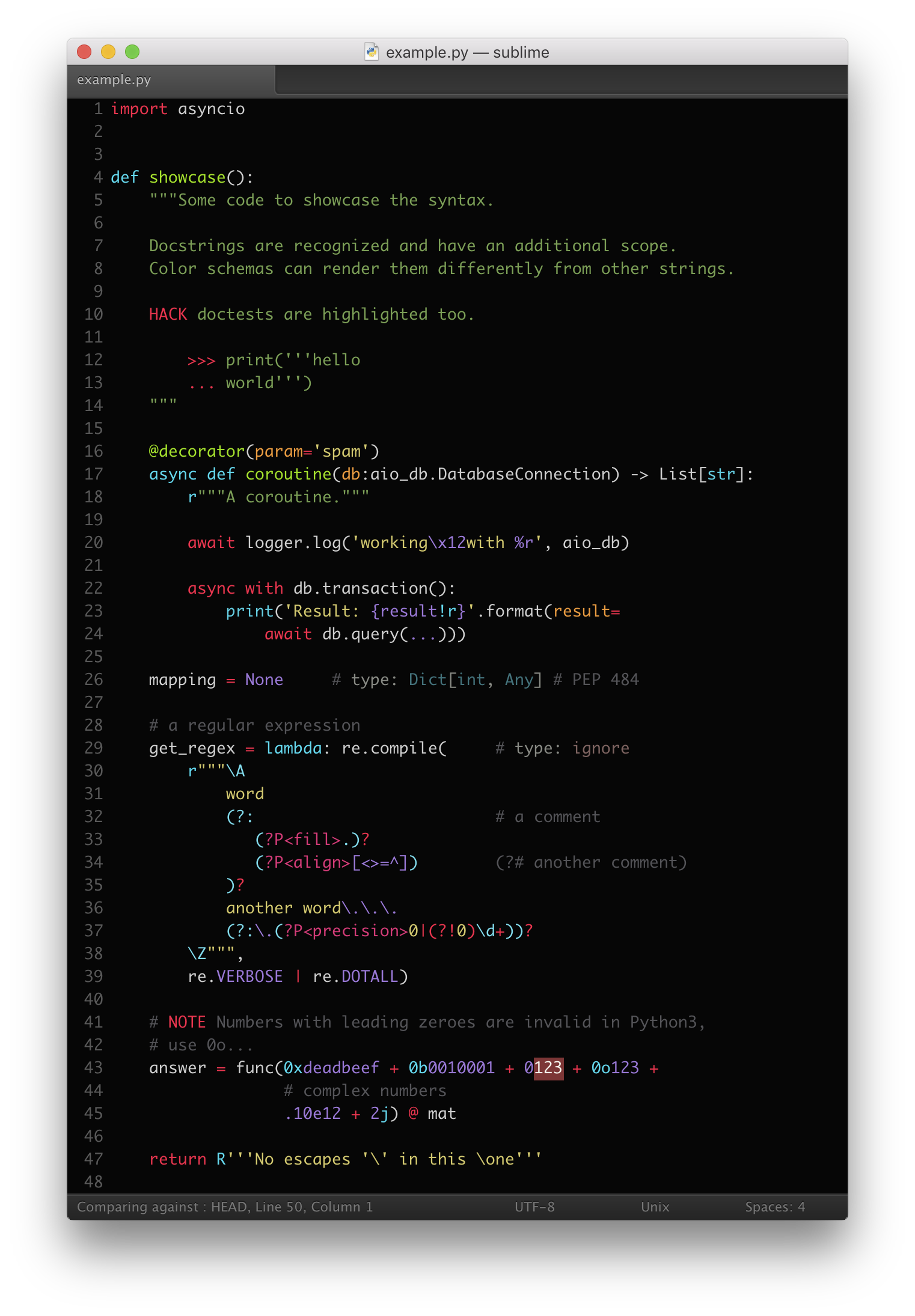 This is a package with preferences and syntax highlighter for cutting edge Python 3, although Python 2 is well supported, too. The syntax is compatible with Sublime Text, Atom and Visual Studio Code. It is meant to be a drop-in replacement for the default Python package.