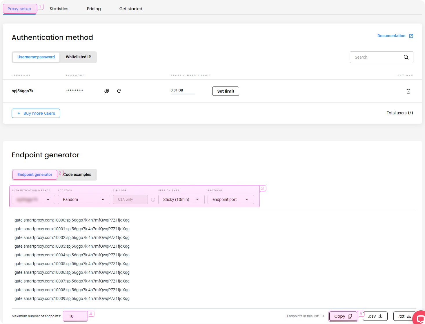 - Select the number of proxy endpoints you want to generate (you'll only need 1 for now).